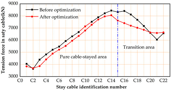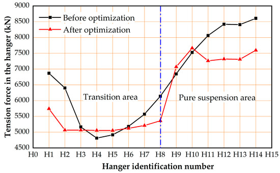 Figure 21 compares hanger forces before and after optimization, while Table 10 compares the key hanger forces. Due to the bridge symmetry, results for only half of the hangers are shown.