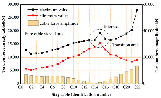 - Optimizing relevant parameters for the stay cables in the transition area leads to a slight reduction in cable forces within the pure cable-stayed area, while the internal forces in the transition area exhibit more uniform and gradual changes. Under both dead and live loads, the cable force amplitude at the boundary between the pure cable-stayed region and the transition area is considerable, showing a significant increase within the transition area. The maximum cable force amplitude in the transition area is approximately 2.5 times greater than that in the pure cable-stayed area, and the force amplitude at the boundary between different regions significantly surpasses that of other stay cables.