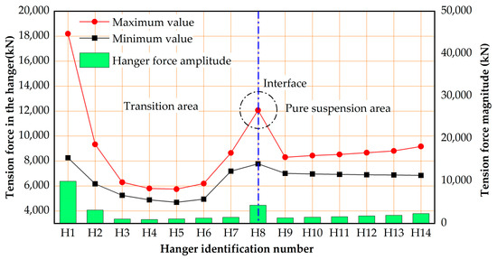 Figure 22 and Table 11 reveal that under the combined effects of dead and live loads, the maximum forces in start hanger (H1) and tail hanger (H8) are relatively high. Specifically, the force in H1 is twice that of H2, and the force in H8 exceeds that of H7 and H9 by 45%. Significant jumps in hanger forces occur at the boundaries between the pure cable-stayed area, transition area, and pure suspension area, due to large differences in structural stiffness. Within each region, the maximum and minimum hanger forces and their amplitudes exhibit minor variations. This analysis suggests that despite some larger hanger forces resulting from uneven stiffness changes, the hanger force distribution has significantly improved through structural parameter optimization.