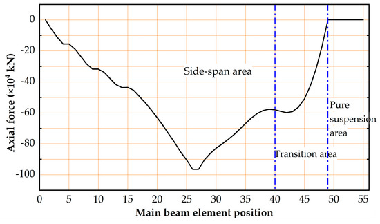As the main beam moves from the edge span to the bridge pylon, the axial force increases and remains compressive, peaking at nearly 1000 MN at the bridge pylon. From the bridge pylon to the center span, the compressive force decreases, and the main beam experiences negligible compression in the pure suspension area.