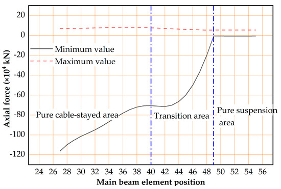 Figure 24 shows the envelope of axial forces in the main beam under the combined effects of dead and live loads. The minimum axial forces in the mid-span main beam follow a similar trend to those under dead load alone, with the beam in the pure suspension area experiencing negligible compression. With varying live load combinations, the mid-span main beam may uniformly experience tension across its entire span, with values below 100 MN.