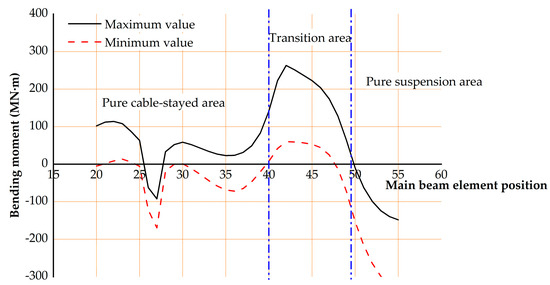 The figure shows that under the combined effects of dead and live loads, the bending moment in the main beam within the pure cable-stayed area varies slightly, within ±100 MN·m. In contrast, in the transition and pure suspension areas, the bending moment varies significantly, with values ranging from 260 MN·m to −150 MN·m.