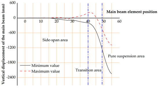 The figures and table show that optimizing the structural parameters of the HCSS bridge has reduced the main beam’s deformation, indicating a significant improvement in the beam’s stiffness. Under the combined effects of dead and live loads, the optimized structure exhibits the maximum vertical displacement of the main beam in the pure suspension area, with a downward deflection of 2247.2 mm. The deflection-to-span ratio is L/630, which is less than the L/500 specified by the standards [38], thus meeting the requirements.
