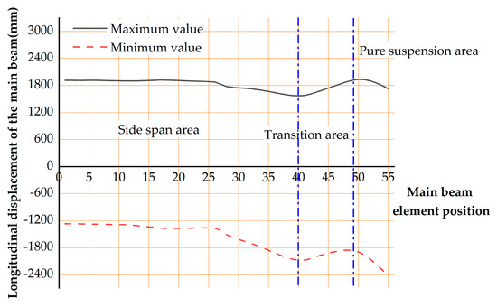 Figure 26 and Figure 27 show that the vertical deflection and longitudinal displacement curves of the main beam are relatively smooth from the edge span to the pure cable-stayed area. However, as the structure transitions from the pure cable-stayed area to the transition area, the displacement curves exhibit noticeable fluctuations. Specifically, the vertical displacement of the main beam reaches a maximum upward deflection in the transition area and a maximum downward deflection in the pure suspension area at mid-span, with a deflection difference of 1311 mm between these points. In the longitudinal displacement curve, both the maximum and minimum values display distinct extrema at the boundaries of the transition area, indicating non-smooth displacement in these areas due to varying stiffness.