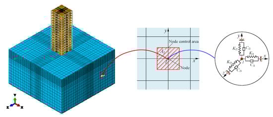 When using limited space to simulate semi-infinite soil, the application of the boundary conditions and seismic inputs significantly influences the accuracy of the calculation. Many scholars [,] extensively researched this area. Among them, the viscous-spring artificial boundary (VSAB) model studied by Liu et al. [] is widely used in the SSI finite element calculations due to its high accuracy and practicality. The VSAB is a continuous parallel-spring damping system on the artificial truncated boundary. It realizes the absorption of external waves from the finite domain to the infinite domain by employing similar springs and dampers on the discrete boundary grid nodes. Figure 1 illustrates the application of the VSAB in the 3D numerical analysis. The surrounding soil material determines the mechanical parameters of the springs and dampers, and the specific formulas are as follows: