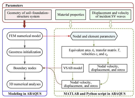 Based on the theory of the VSAB and seismic wave input method, a Python script was developed by the author to transform the displacement and velocity time history of the SV waves into a nodal force time history and transfer all the nodal force time history to the software ABAQUS (see Figure 2).
