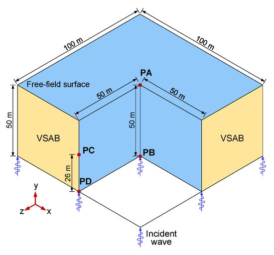 The precision of the VSAB and seismic wave input method significantly influences the accuracy of numerical analysis results when considering the dynamic SSI. Therefore, this study utilized an illustrative example of external source fluctuations to validate the precision and accuracy of the VSAB method and seismic wave input by comparing the numerical and analytical solutions. To this end, a calculation region with dimensions of 100 m (length) × 100 m (width) × 50 m (height) was considered within the 3D infinite elastic half-space for the numerical analysis. The material properties of the finite region were defined as follows within the 3D infinite elastic half-space: the mass density was 2000 kg/m3, the elastic modulus was 200 MPa, Poisson’s ratio was 0.25, and the shear wave velocity was 200 m/s. The schematic diagram of the calculation model is shown in Figure 3, and the observation points selected for the analysis are denoted as PA, PB, PC, and PD.