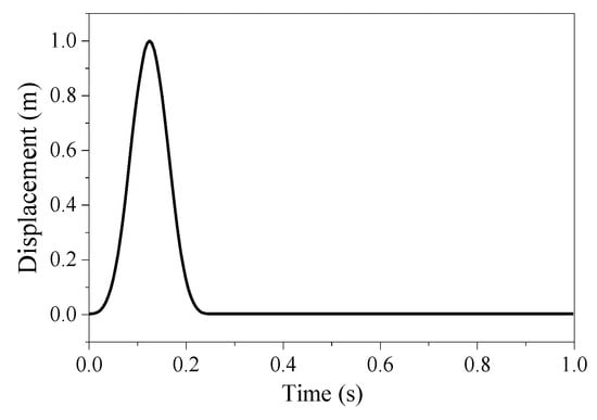 where G4(τ) = τ3H(τ), τ = t/T0, F0 = 0.5 m, T0 is the pulse duration, and H(τ) is the Heaviside function. In this study, T0 = 0.25 s, total duration = 1.0 s, and time step = 0.005 s. The displacement time history of the input signal is shown in Figure 4.