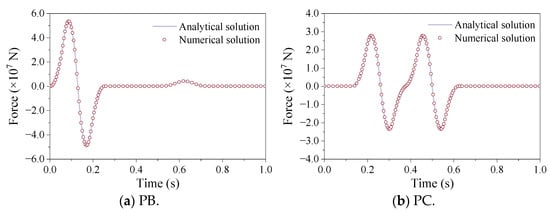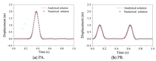 Figure 5 compares the displacement time history obtained using the VSAB and seismic input method based on the wave superposition technique with the analytical solution. This comparison was made at the bottom observation point PB and the free surface observation point PA within a homogeneous half-space finite-domain model. The results show that the SV wave, which propagated vertically, reached the free surface of the ground after 0.375 s, accompanied by the superposition of the reflected wave. At the free surface observation point PA, the maximum horizontal displacement response was twice the amplitude of the incident wave, and its waveform corresponded to the incident wave. By 0.50 s, the shaking of the free surface ceased, and the displacement response became zero. This indicates that the reflected wave was fully absorbed by the VSAB upon reaching the bottom artificial boundary, without being reflected to the ground. Figure 5 also presents the numerical calculation results of the displacement time history of the free-field surface observation point PA and the bottom observation point PB, consistent with the analytical solution. The results of these numerical simulations were in line with the theory of wave propagation laws, thereby proving the correctness and validity of the VSAB setting and seismic input procedures discussed in this paper.