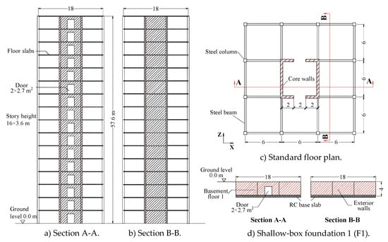 To understand the role of the basement systems on the nonlinear dynamic behavior of the steel frame–core wall (SFCW) structure under earthquake excitations, a box foundation system with a one-floor basement (F1) was considered in this work (see Figure 7d), which referred to the foundation system form in the literature []. The foundation system with underground structures is widely used as storage rooms or underground garages in cities with high building densities. The F1 system is a relatively shallow-box foundation, with a 4 m height basement beneath ground level, lying on 0.6 m thickness RC base slabs. Table 1 shows the characteristics of the structure and foundation system in the section.