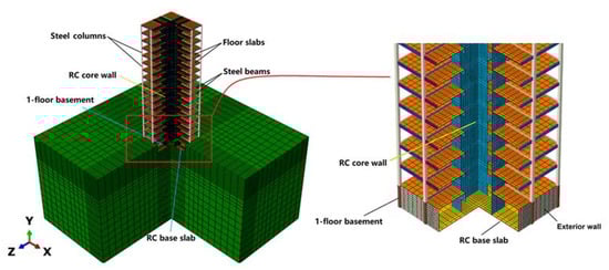 In this study, the steel material grades of all columns and beams were Q345. All the concrete materials for the RC walls and slabs were C45 grade concrete. All the steel bar materials in the RC walls and slabs were HRB400. Furthermore, uniformly distributed dead loads (DLs) and live loads (LLs) of 2.0 kN/m2 each were considered for all the floors. The gravity loads combination (1.0 × DL + 0.5 × LL) was adopted according to the Chinese load design code [].