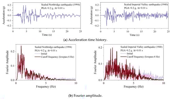 Seismic inputs play a crucial role in determining the dynamic response of a structure subjected to seismic excitation, especially when considering the soil–foundation–structure interaction. In this work, two widely used earthquake records were employed as seismic inputs based on similar site information of the designed structure obtained from the Pacific Earthquake Engineering Research Center (PEER) NGA-West 2 ground motion database. One of the selected ground motions was a near-fault pulse-like motion recorded at the Sylmar Converter Sta Station during the 1994 Northridge earthquake event. The other was a near-fault non-pulse-like motion recorded at the El Centro Array #9 station during the 1940 Imperial Valley earthquake event. Table 6 summarizes the corresponding ground motion parameters. To reduce the computation, all records were baseline corrected and scaled to a maximum acceleration of 0.2 g with a duration of 25 s and a time step of 0.01 s. A cutoff frequency of 6.0 Hz was employed in this study by the critical frequency Equation (7) to avoid any adverse effects of the high-frequency components of the input ground motions. The scaled acceleration–time history and Fourier amplitude curves for the two earthquake records are presented in Figure 9.