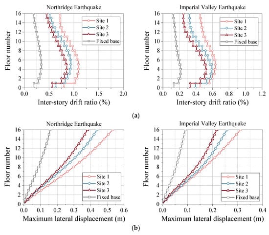 Comparing the IDR response under different soil profiles in Figure 10 a, it can be observed that the soil properties had a significant impact on the IDR distribution of the structures. Specifically, the maximum IDR was obtained on the soft-soil site (i.e., Site 1), and with the increase in soil hardness from Site 1 to Site 3, the maximum IDR gradually decreased, where the fixed-base foundation exhibited the smallest IDR at 0.344% (approximately equal to one-third of that observed at Site 1). The difference in the maximum IDR between Site 2 and Site 3 was not significant, with the IDR at Site 2 being approximately 1.1 times that of Site 3. The same conclusion could be drawn from Figure 10b: with the increase in soil hardness from Site 1 to Site 3, the maximum lateral displacement gradually decreased. This was primarily due to the significant amplification effect of the site’s soil on the seismic signal, which became more pronounced as the soil hardness decreased.