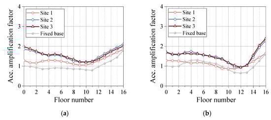 Notably, the amplification factors of the structural floor accelerations at Site 2 and Site 3 exhibited a relatively close resemblance, surpassing those at Site 1 and under fixed-base conditions. Additionally, the amplification factors of the ground floor acceleration at Site 2 and Site 3 surpassed those at Site 1. This observation can be attributed to the soft-soil characteristics of Site 1, whereby the seismic waves prompted the rapid transition of the soft-soil layer into a nonlinear state. As a result, the soil foundation demonstrated amplified hysteresis energy dissipation, which resulted in a diminished amplification effect of the soft soil on seismic waves.