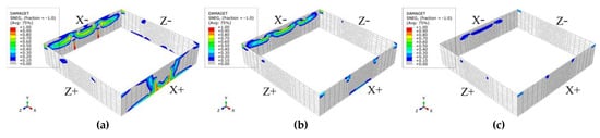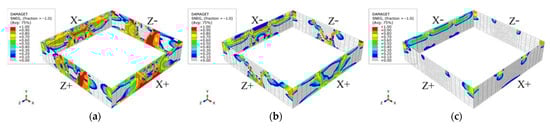 Figure 12 and Figure 13 illustrate the tensile damage of the basement exterior walls. Based on Figure 12 and Figure 13, it was apparent that the extent of tensile damage to the basement exterior walls was most pronounced under the Site 1 conditions. Furthermore, as the soil stiffness of the site increased (i.e., from Site 1 to Site 3), the tensile damage to the basement exterior walls decreased significantly. More specifically, irrespective of the site type, the damage to the basement exterior walls in the “X-” direction was considerably more pronounced than in the “X+” direction. Furthermore, in the “X-” direction, the predominant tensile damage was concentrated in the upper section of the basement exterior walls, while the lower portion of the walls typically experienced relatively smaller amounts of tensile damage. In contrast, in the “X+” direction, the primary tensile damage occurred in the lower section of the basement exterior walls, with comparatively minor tensile damage observed on the sides of the walls.