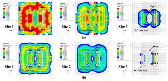 By comparing Figure 14 and Figure 15, it can be observed that akin to the basement floor slab, the tensile damage to the first-floor slab displayed a symmetrical distribution along the x-axis. Compared with the stiff-soil conditions at Site 3, the soft-soil conditions at Site 1 exhibited more pronounced tensile damage on the first-floor slab. Particularly, the region surrounding the core wall, especially the floor slabs adjacent to the door openings, experienced the highest levels of tensile damage. This phenomenon could be attributed to door openings within the core wall, which compromised its deformation resistance and reduced the flexural stiffness in the x-direction. Consequently, the core wall’s restraining effect on the floor slabs adjacent to the door openings was weakened.