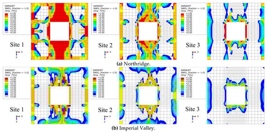 Figure 14 presents the distribution of the tensile damage in the basement slab of the SFCW structure under the seismic effects of the Northridge and Imperial Valley earthquakes. Figure 14 reveals that under seismic action in the x-direction, the tensile damage in the RC basement slab exhibited a symmetrical distribution along the x-axis. Specifically, under the Site 1 conditions, the RC basement slab experienced the largest area of tensile damage, concentrated primarily near the RC core wall, and formed an approximate circular pattern. The maximum value of the tensile damage reached 0.95, indicating a near-complete tensile failure. Under the Site 2 conditions, the basement slab of the SFCW structure exhibited pronounced tensile damage in the interior of the core wall and on the outer sides of the door, with a maximum tensile damage value of 0.93. Conversely, the outer edges of the basement slab remained largely unaffected by the tensile damage. Notably, under the Site 3 conditions, the extent of the damage in the basement slab decreased further, with the tensile damage concentrated solely in the connection region between the RC core wall and the basement slab. No tensile failure occurred in the outer edges of the basement slab, the maximum value of the tensile damage reduced to 0.88, and the tensile damage in the basement slab on the sides of the basement door was not notably pronounced. Furthermore, the presence of a core wall provided a restraining effect, which resulted in less severe damage to the basement slab in the interior and at the exterior corners of the core wall.