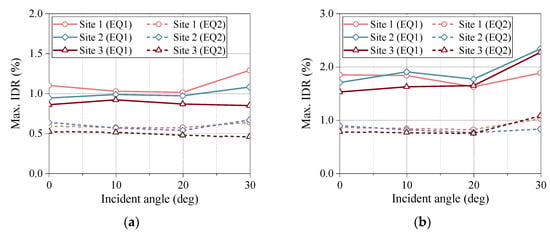 As illustrated in Figure 16, the structural response under the EQ1 seismic action consistently exceeded that of EQ2 when the angle of incidence of the ground motion ranged from 0 to 30 degrees. Specifically, the variation in the maximum inter-story drift ratio was more pronounced at incidence angles of 20 to 30 degrees than at 0 to 20 degrees, with a more significant effect observed at a seismic input intensity of 0.3 g compared with 0.2 g. Furthermore, the change in the incident angle of the ground motion had a more significant impact on the seismic response of the structure under pulse-like ground motion than under non-pulse-like ground motion.