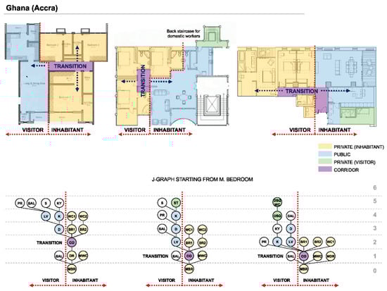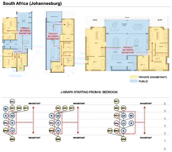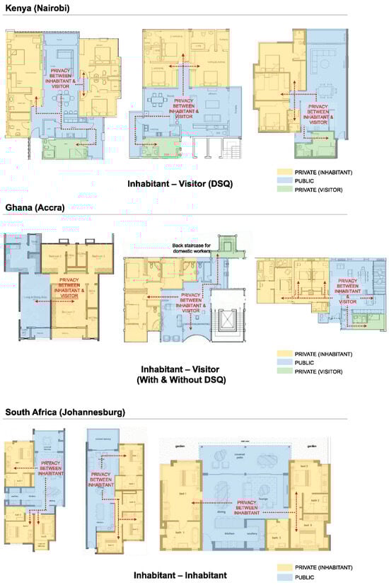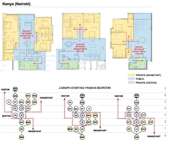 A key differentiator in the spatial syntax of apartments across the three countries was the configuration and distribution of private areas, as shown in Figure 3. Kenyan and Ghanaian apartments exhibit pronounced segregation between zones for inhabitants and visitors, manifested in clustering private rooms. This spatial pattern aligns with an “inhabitant-visitor” layout typology, indicating a cultural emphasis on maintaining a clear distinction between private and public spheres within the dwelling. In contrast, South African apartments demonstrate a distinct “inhabitant-inhabitant” layout, characterized by a more dispersed distribution of private rooms throughout the unit. This configuration suggests prioritizing individual privacy and autonomy within the household, potentially reflecting differing sociocultural norms and living practices.