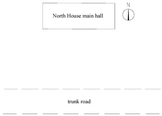 The North House main hall in the middle court features a unique and grand design, serving as the core component of the North Courtyard. It embodies the exquisite architectural artistry and profound cultural significance of the Ming Dynasty. The plane of North House main hall is rectangular, oriented north–south. It spans five rooms with a total width of 20.05 m and a depth of three rooms totaling 14.41 m. The ridge height reaches 11.4 m, featuring a double-eave two-story pavilion-style brick and wood structure with a rigid roof. Figure 1 depicts the elevation plan of North House main hall. The North House main hall is located on Minzhu West Road in the Qinzhou District of Tianshui City, Gansu Province. It is only slightly over 40 m away from major traffic arteries within the city. Following the May 12 earthquake, the wooden structure of North House main hall suffered severe damage. Figure 2 shows the location schematic of North House main hall. With the economic development and population growth in Tianshui, ground traffic flow has continued to increase. Persistent ground traffic vibrations year-round have caused damage to the wooden structures. Over time, this cumulative damage has led to fatigue, the loosening of joints, and structural deformation and posed severe threats to safety and lifespan. Urgent research is needed to assess the dynamic response and safety of the wooden structures of North House main hall under traffic-induced conditions. This research will provide the basis for the maintenance, repair, and management of the wooden structures in Tianshui’s ancient residences.