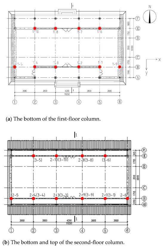 Three-axis velocity sensors are installed at each measurement point, with each test duration not less than 20 min and conducted at least twice. The layout of measurement points is as shown in Figure 3, with north at the top, south at the bottom, west on the left, and east on the right. Ten measurement points are placed at the base of columns on the first floor of the timber structure, designated as 1–1 to 1–10. Eight measurement points are positioned at the base of columns on the second floor of the timber structure, labeled as 2–1 to 2–10. Eight measurement points are located at the tops of columns on the second floor of the timber structure, denoted as 3–1 to 3–10.
