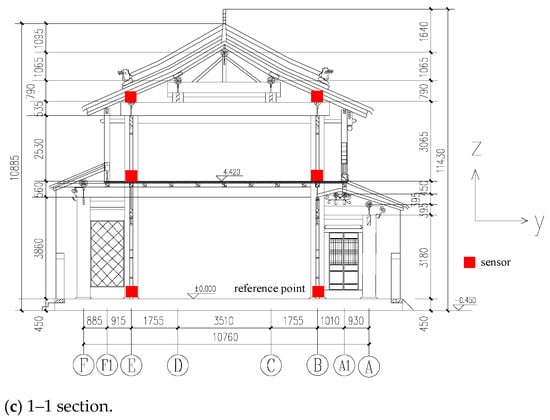 “Technical Code for Protection of Ancient Buildings against Industrial Vibration” uses the horizontal vibration velocity of the top column as the evaluation criterion [13]. In this test, vibration velocities in three directions at various measurement points of the wooden structure of the North House main hall are tested. Sensors are deployed on the roadway and at each floor level of the wooden structure. Vibration induced by vehicle loads generally exhibits low-frequency characteristics. According to the specifications, the sampling frequency is set to 50 Hz.