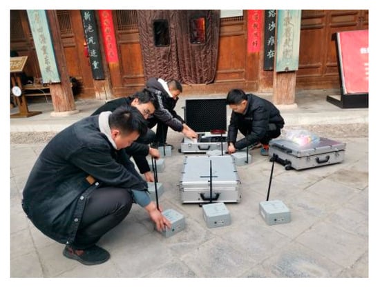 The impact of traffic-induced vibrations on ancient architecture has received significant attention from domestic and international scholars, leading to extensive research efforts and relevant achievements in this field. To study the seismic performance of timber structures, many researchers have conducted shaking table tests on scaled models [2,3,4,5]. Due to the high costs of testing and the lack of general applicability, many researchers have adopted a cost-effective approach. This method involves the dynamic property testing of timber structures and the establishment of finite element models, which are validated through dynamic testing. Fang et al. [6,7] conducted on-site measurements and model tests on the North Gate of the Xi’an City Wall to study the basic characteristics of the timber structures. Multipoint excitation tests on the wooden models validate that the first and second modes obtained by the on-site full-scale test are the vibration modes of the tower. Wu et al. [8] and Pan et al. [9] established finite element models of timber structures and validated the model accuracy with the data from on-site tests to study the dynamic characteristics and seismic responses of the timber-frame structures. Che et al. [10] conducted on-site dynamic testing to analyze the dynamic characteristics and damage mechanics of the Yingxian Wooden Pagoda in Shanxi. Altunisik A. C. et al. [11] studied the structural condition of a restored historical timber mosque, conducting the finite element analysis, ambient vibration tests, and model updating to minimize the differences and reflect the current situation. Ahmet C. A. et al. [12] conducted eight ambient vibration tests on historical masonry armory buildings and determined the nonlinear dynamic response of historical masonry armory buildings using a validated finite element model.