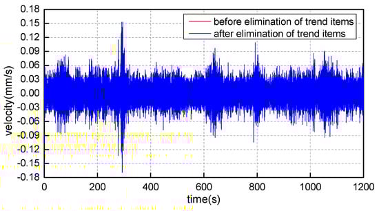 The vibration signals collected during vibration testing often deviate from the baseline due to zero drift caused by amplifier temperature changes, instability in low-frequency performance outside the sensor’s frequency range, and environmental interference around the sensor. The magnitude of deviation from the baseline over time refers to the trend of the signal [14,15]. The most commonly used method to remove the trend is polynomial least squares fitting. Taking the example of the Y-direction at measurement point 2–3 on the second-floor column base, Figure 7 shows the comparison of the velocity time history curve before and after removing the trend in the Y-direction at measurement point 2–3 on the second-floor column base.