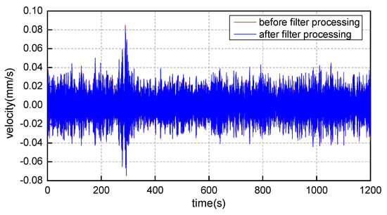 Figure 9 depicts the comparison of the velocity time–history curves in the Y-direction at measurement point 2–3 on the second-floor column base before and after filtering. From Figure 9, it is evident that interference largely masks the true signal amplitude. After applying a low-pass filter, some spikes are removed, thereby attenuating the influence of interference signals.