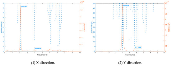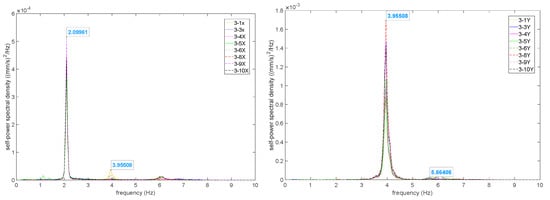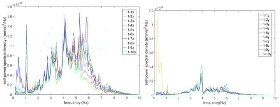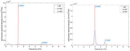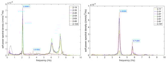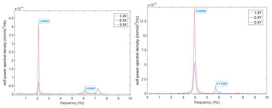 The peak picking method, based on the Welch method principle, is used to determine the frequencies of the structure. The modal parameters of the system are identified based on the principle that peaks appear in the power spectral density function at the natural frequencies of the system [17]. The Welch method is employed to sequentially estimate the power spectral density functions of response signals at each measurement point, obtaining the self-power spectral density in both the X and Y directions at each layer measurement point, as shown in Figure 10.