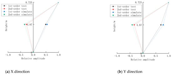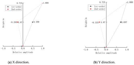 Based on the results of modal parameter identification using the auto-spectral method and the random subspace method, the first two modal shapes in the east–west and north–south directions of the wooden structure of North House main hall are obtained, as shown in Figure 15. The analysis of Figure 15 indicates that the first-order modes in both X and Y directions exhibit bending behavior, with greater amplitudes observed at higher floors. The second-order modes display a bending–shear behavior, indicating that the structure experiences bending and shear movements during vibration.