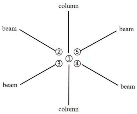 (2) Wood beams and columns are simulated using the 3D elastic element Beam188, capable of withstanding tension, compression, and torsion. Each node has six degrees of freedom: translation along the x, y, and z directions and rotation about the x, y, and z axes. The large roof is simulated using the Mass21 mass element, which has six degrees of freedom: translation along the x, y, and z directions and rotation about the x, y, and z axes. Each direction can have a different mass and moment of inertia. The beam–column joints are simulated using the Combinl4 element, which can model one-dimensional, two-dimensional, and three-dimensional longitudinal or torsional spring effects. Establish multiple coincident finite element nodes at the mortise and tenon joints of beams and columns, applying spring elements only at the beam and column connections. The spring stiffness coefficients are Kx = Kz = 1.71 × 107 N/m, Ky = 2.08 × 108 N/m, kθx = kθy = kθz = 6.244 × 108 N·m/rad [26], as shown in Figure 16.