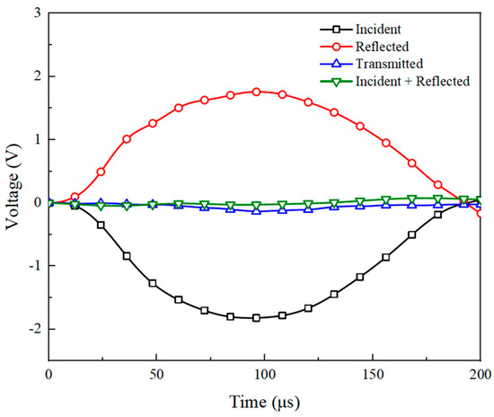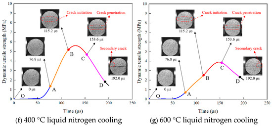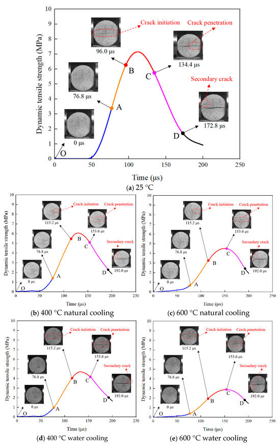 - Crack development stage: The graph corresponds to the BC segment, and as the loading progresses, the main crack of the specimen gradually expands, and some secondary cracks appear. At this stage, the curve goes through an increase and reaches the maximum dynamic tensile strength before starting to decrease, indicating that the degree of specimen failure further increases.
