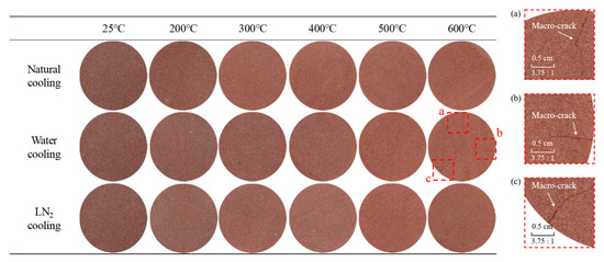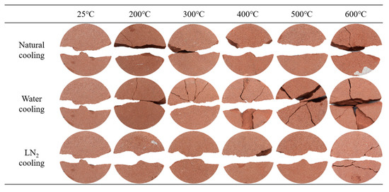 - Under the same thermal treatment temperature conditions, the three cooling approaches also significantly influenced the crushing mode, with water cooling having the most significant impact. In a thermal treatment temperature of 600 °C, under natural cooling conditions, it was broken into three pieces; under liquid nitrogen cooling conditions, it was five pieces; and in underwater cooling conditions, it was six pieces, and there were significant cracks on some of the fragments. The main factor for this is that the differential expansion of sandstone mineral composition at high temperatures results in the increase and propagation of micro-cracks [5]. Water cooling also undergoes hydration reactions with clay minerals between micro-cracks, resulting in a decrease in cohesion between particles and the emergence of more micro-cracks. The degree of fragmentation under impact load is more significant.