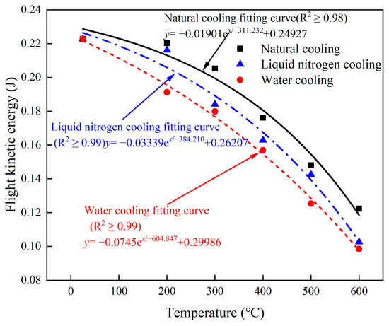 - Using the same cooling methods, with the increase in heating temperature, the specimen’s wedge-shaped area progressively enlarged under impact load. The quantity of specimen fragments increases while the size decreases. With underwater cooling, the sample formed two large pieces at ambient temperature (25 °C). As the thermal treatment temperature continued to 500 °C, the sample broke into six fragments under the same impact speed conditions [10].
