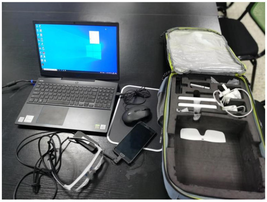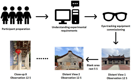 Considering the significant interference that light can cause in eye-tracking experiments [45], our experiment was conducted in a room devoid of outdoor light sources. The experimenter sat at a table and watched pictures projected on a computer screen. The only light source other than the computer was the internal lighting of the room. We used a portable eye tracker manufactured by Senso Motoric Instruments (SMI), Teltow, Germany. With a sampling frequency of 250 Hz and a weight of only 246 g. The eye tracker manufactured is show in Figure 1. The eye tracker can be worn for free observation without any discomfort and is not restricted by large equipment, thus allowing participants greater mobility in the experimental space. Eye movement data were recorded using a Samsung Galaxy mobile phone (Samsung Electronics Co., Ltd., Suwon-si, South Korea) for up to 4 h of continuous on-site recording. The device was integrated with the Begaze (Version 3.5.101.9021) software analysis platform for the statistical analysis of eye movement data. Figure 2 outlines the experimental procedure for the eye-tracking study. The procedure is as follows: