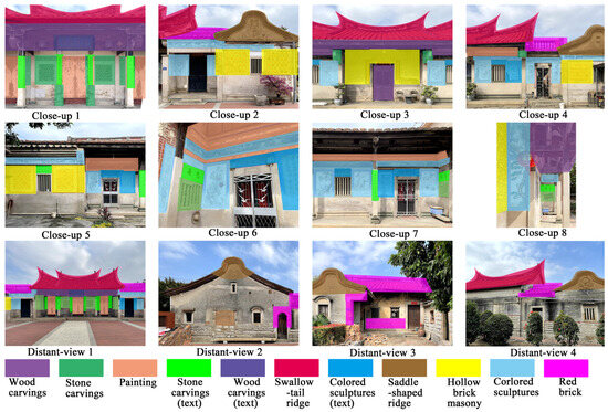 In addition to the swallow-tailed ridges, saddle-shaped ridges, and the characteristic use of red bricks, traditional Southern Fujian red-brick mansions boast an array of intricately crafted architectural decorations. These include wood carvings, stone carvings, hollow brick masonry, paintings, and colored sculptures. Such decorations are important cultural value carriers of Southern Fujian architecture. Given the intricate details of these elements, which cannot be fully appreciated from a distance, we conducted further experiments using eight close-up images taken at “Liantang Villa”. These images highlight various architectural decorations. Table 6 provides the specifics of each close-up image.