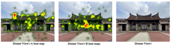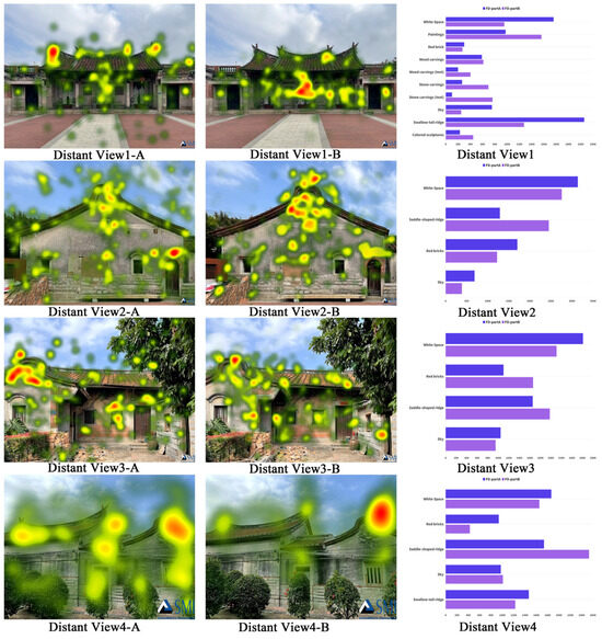 Distant-views 3 and 4 present the front elevation of the outbuilding and the rear elevation of the “Wan Zai Tang” hall, respectively. In these scenes, both Groups A and B concentrated their gaze on the swallow-tailed ridges and saddle-shaped ridges; both groups also spent significant time looking at the large blank areas, which included visual elements like door and window openings and landscape plants. However, Group B’s gaze was relatively more focused compared to Group A’s gaze. In contrast, Group A participants’ gaze often lingered on the sky, surrounding trees, and non-architectural objects in the landscape.