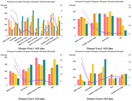 For instance, in Distant-view 1, while the non-textual elements like paintings and red bricks did not yield significant differences, the wood carvings with text elements revealed a significant difference in FFD (t = −3.05, p = 0.008) and AFD (t = −3.40, p = 0.004), indicating that Group B participants exhibited longer initial gaze times and average fixation durations on these culturally rich items. Similar patterns were observed with stone carvings that included text, where notable differences were found in both FFD (t = −3.42, p = 0.004) and FC (t = −3.72, p = 0.002).