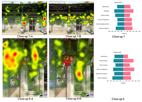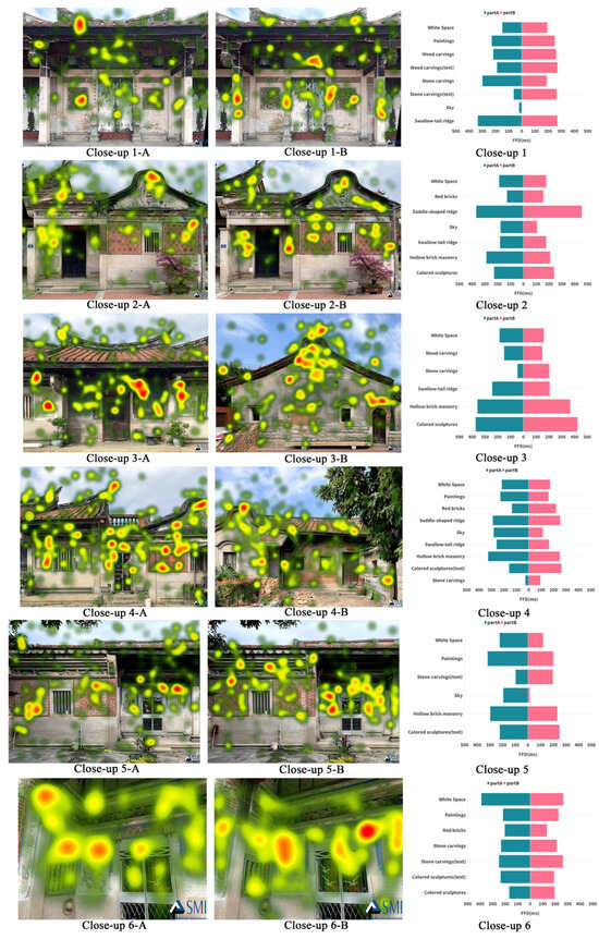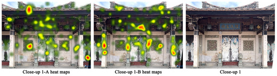 In Figure 6, the first and second column show the Heat Maps of the Group A and B as they watch from a close range. The darker-colored areas (red) in the heat map indicated that the location had been watched for longer and had a larger FD value. The heat maps in Figure 6 demonstrate notable discrepancies in the observation outcomes of architectural embellishments between Group A and Group B participants. In Close-up 1, Group A participants demonstrated a notable interest in the swallow-tailed ridge, stone carvings, and wood carvings. However, the inscriptions carved on the stone columns flanking the image were largely overlooked by Group A participants, whereas they attracted considerable attention from Group B participants. Furthermore, Close-up 2 depicts the saddle-shaped ridge observed in the distant views. The saddle-shaped ridge is more ornate than those in Distant-view 2, attracting greater attention from both Group A and Group B. Furthermore, when the gaze of both groups first moved to the colored sculptures and hollow brick masonry, they exhibited a longer duration of fixation.