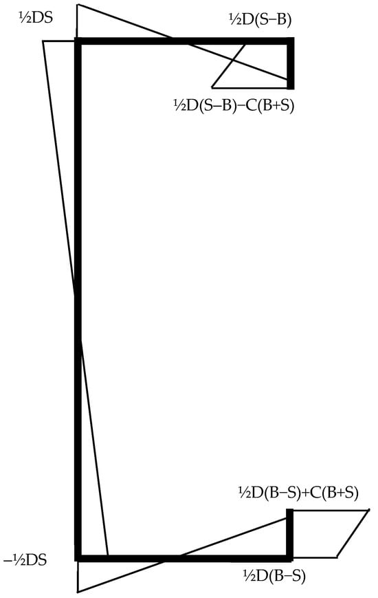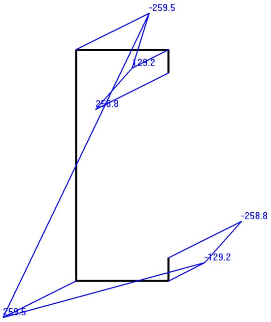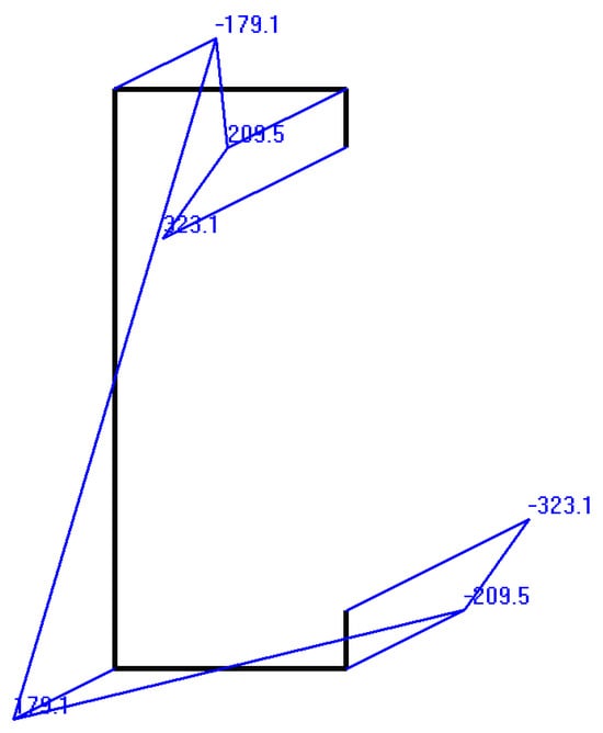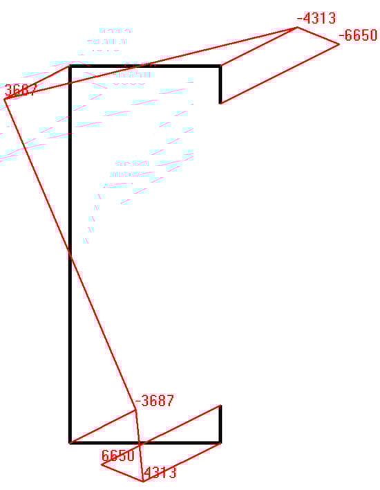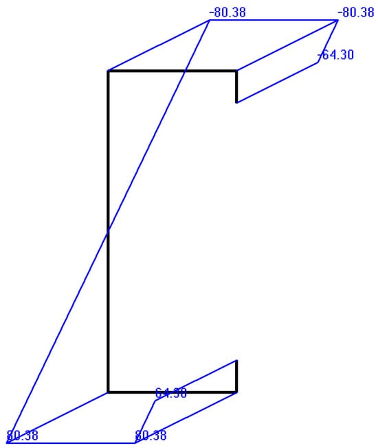 The longitudinal stress distribution caused by the bimoment calculated by THIN-WALL-2 is plotted in Figure 7, where positive values indicate tensile stress and negative values indicate compressive stress. It can be seen in Figure 7 that the maximum longitudinal stress calculated by THIN-WALL-2 agrees with the above value for fb calculated by Equation (15).