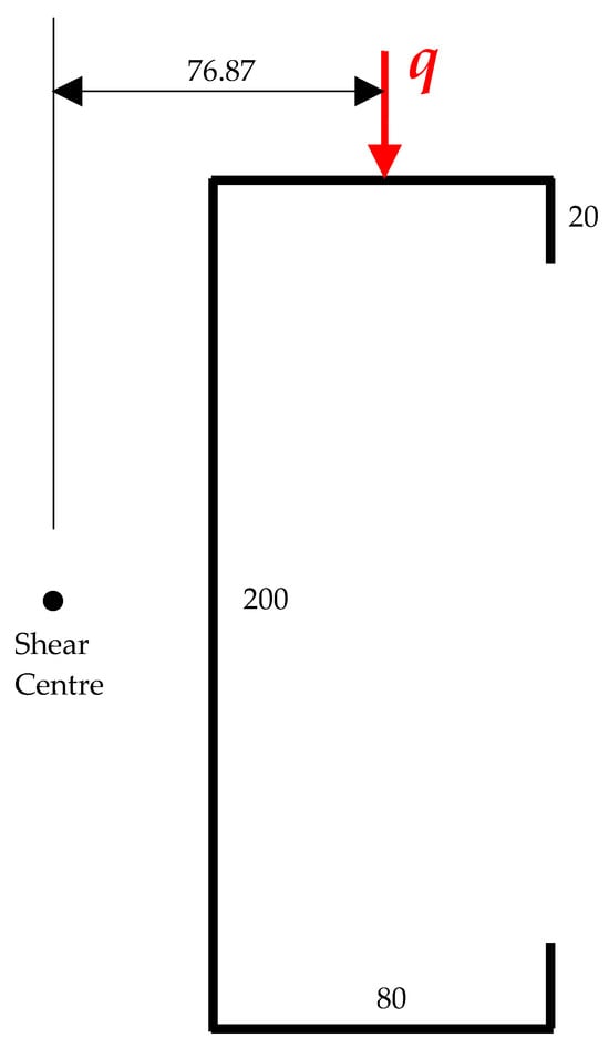 The channel section shown in Figure 5 is of length L = 5000 mm and is subjected to a uniformly distributed load q = 1.0 N/mm acting in the middle of the top flange. The channel has a web depth of 200 mm, a flange width of 80 mm, a lip length of 20 mm and a thickness of 1.5 mm. The section properties of the channel were calculated using the cross-section analysis program THIN-WALL-2 [,] as