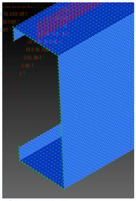 To validate the theoretical derivation of the angle of twist rotation and the longitudinal stresses derived in the previous sections, the channel member in the previous example was analysed using the commercial finite-element analysis program Strand7 []. The channel was modelled using four-node shell elements, which were developed based on the thin-shell theory described by Jetteur and Frey []. Each node has six degrees of freedom comprising translational displacements along the x, y and z axes and rotational displacements about the x, y and z axes. A convergence study found that a mesh size of 5 × 5 mm plate elements was satisfactory to achieve an accurate solution.