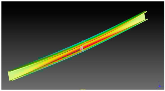 A linear elastic analysis on the channel member was performed using Strand7. The maximum twist rotation at mid-span was reported to be 36.30°, which agrees very well with the theoretical value calculated from Equation (12). The maximum longitudinal stress in the section was reported as 260.5 MPa, which is in close agreement with the maximum stress shown in Figure 9. The deformed shape of the member with the longitudinal stress distribution is shown Figure 11, where the maximum stresses can be seen at the flange-web junctions.