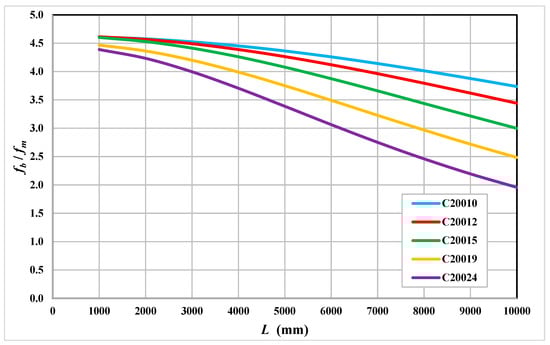 Figure 13 shows the variation of the ratio of the maximum stress due to the bimoment fb with the maximum stress due to the bending moment fm with the span length L for the five channels. The graph in Figure 13 shows that the fb/fm ratio is always greater than 1.0 for all practical span lengths, indicating that the maximum stress due to the bimoment is always greater than the maximum stress due to the bending moment. The ratio is particularly high for short span lengths and is also high for very thin channels. The ratio decreases as the span length increases, with the decrease being more significant for the thicker channels.