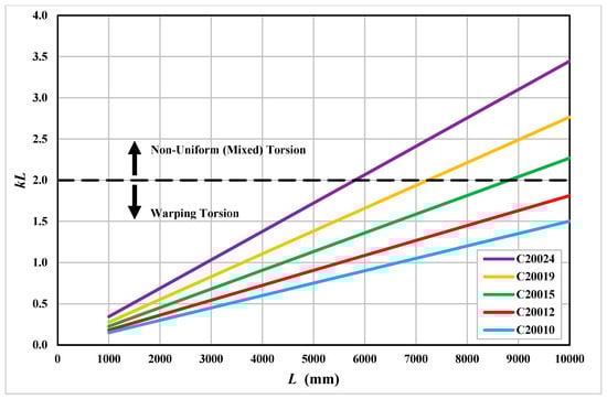 The above results can be investigated further by examining the dimensionless torsion parameter kL (Equation (5) multiplied by the span length L), which can be used to determine if the member is in a state of either warping torsion or uniform torsion or a combination of these (non-uniform torsion or mixed torsion). Kollbrunner and Basler [] showed that, for small values of kL (<2.0), the member is predominantly in a state of warping torsion, while for large values of kL (>5.0), the member is mainly in a state of uniform torsion. Values of kL between 2.0 and 5.0 indicate that the member is in a state of non-uniform (mixed) torsion. Figure 14 shows the relationship between kL and the span length for the cold-formed steel channels. It can be seen in Figure 14 that thin channels and channels with short span lengths all have low values of kL, which indicates that these channels are predominantly in a state of warping torsion and hence experience large stresses due to the bimoment.