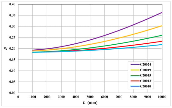 where fmax is the maximum stress in the section due to the bending moment, while fm and fb are the bending and torsional stresses at the location in the section where the combined bending and torsion stress effect is greatest. Figure 15 shows the relationship between R and the span length L for the cold-formed steel channels. As expected, the reduction in the bending-moment capacity is high for short-length beams and also for very thin channels. The reduction decreases as the span length is increased, with the decrease being more significant for thicker channels.