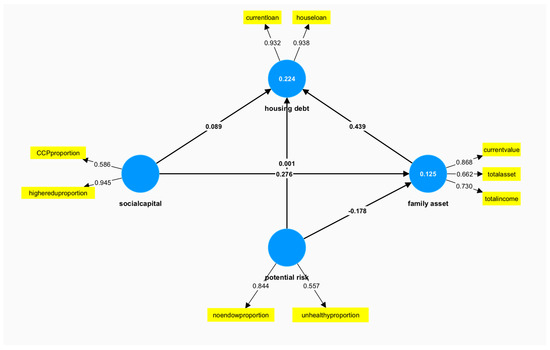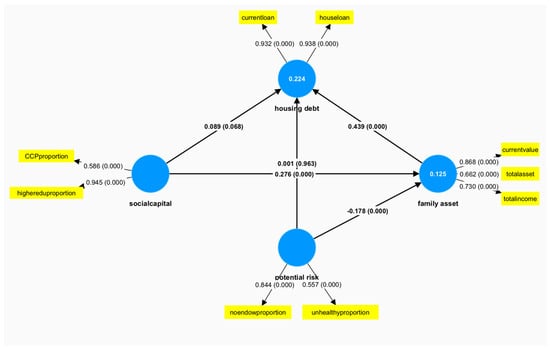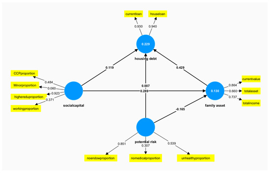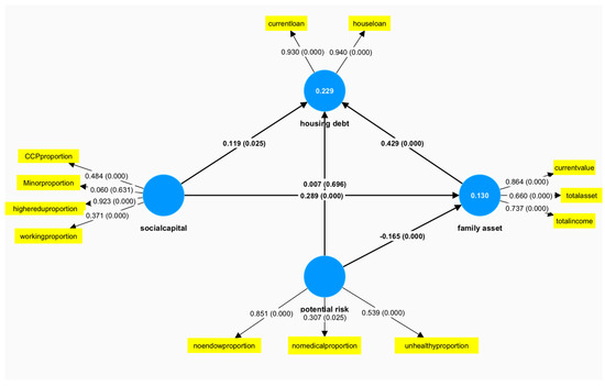 Table 4(a) shows the composite reliability and average variance extracted (AVE)—the quality of the model increases by removing two items. Table 4(b) shows the cross-loadings for all items in the new model. By removing the two items, all have the largest loading in their latent variables, which satisfies the requirement by [51]; hence, the discriminate validity problem will not occur. Table 4(c) illustrates that VIF values satisfy the “less than 5” criteria [51]. Hence, the multi-collinearity problem is not likely to occur. Table 4(d) shows the outer loadings, T-statistics, and p-values. All the routings are significant at a 95% level. Table 4(e) reveals the path coefficients among the latent variables. The routing “potential risk to housing debt” and “social capital to housing debt” are still insignificant, with p value = 0.963 and 0.068, respectively. Besides, the coefficient from “Potential risk” towards “Family assets” is negative, which indicates adverse effects with β = −0.178 and p = 0.000. For the rest of the routings, they are all significant and positive.