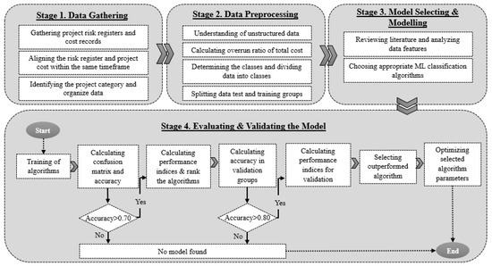 The employed methodology of this study to achieve the objectives is composed of four main stages: (1) data gathering, (2) data preprocessing, (3) model selecting and modeling, and (4) evaluating and validating the model.