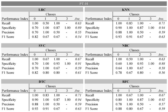 Subsequently, the cross-validation performance indices were computed by repeating the procedure ten times to generate confusion matrices and performance indices for each class within the PT.01 and PT.02 groups. The average scores of performance indicators for four classes are computed and presented in Table 7 for each classifier.